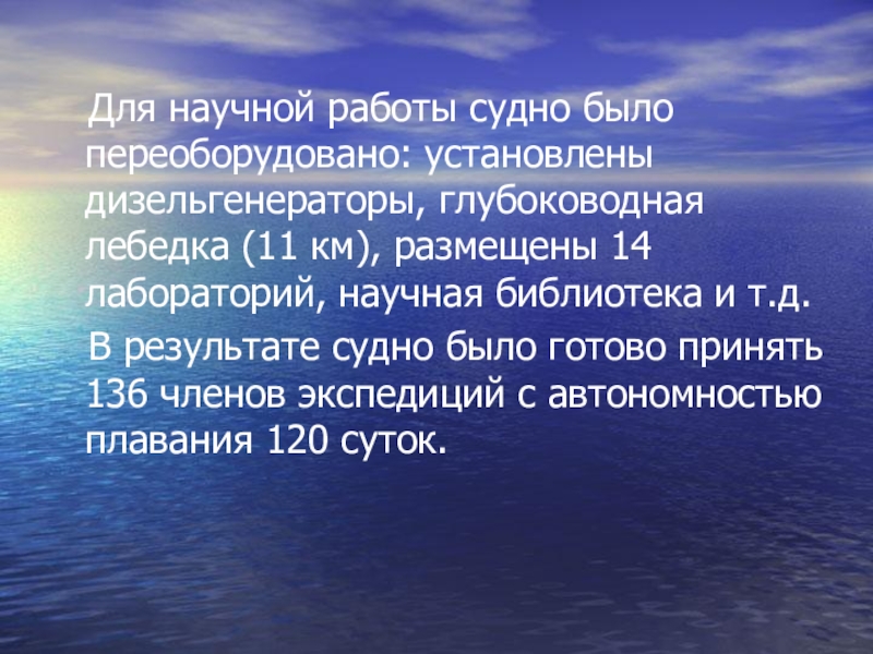 Слайд 7 Для научной работы судно было переоборудовано: установлены дизельгенераторы, глубоководная