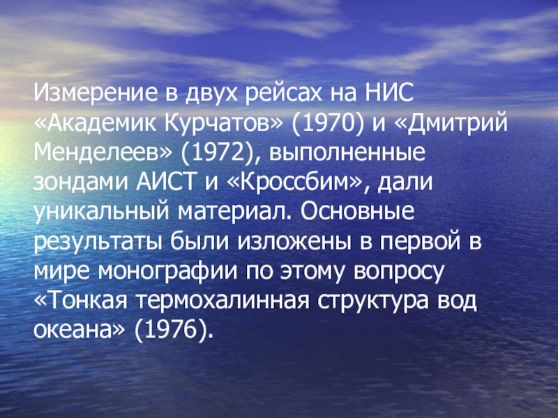 Менделеев» (1972), выполненные зондами АИСТ и «Кроссбим», дали уникальный материал. Основные результаты были изложены в первой в мире монографии по этому вопросу «Тонкая термохалинная структура вод океана» (1976).