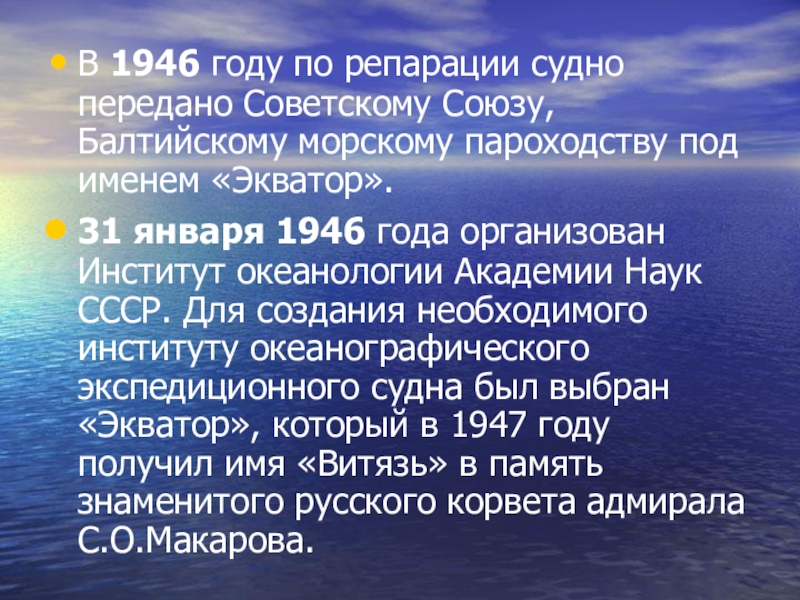 31 января 1946 года организован Институт океанологии Академии Наук СССР. Для создания необходимого институту океанографического экспедиционного судна был выбран «Экватор», который в 1947 году получил имя «Витязь» в память знаменитого русского корвета адмирала С.О.Макарова.