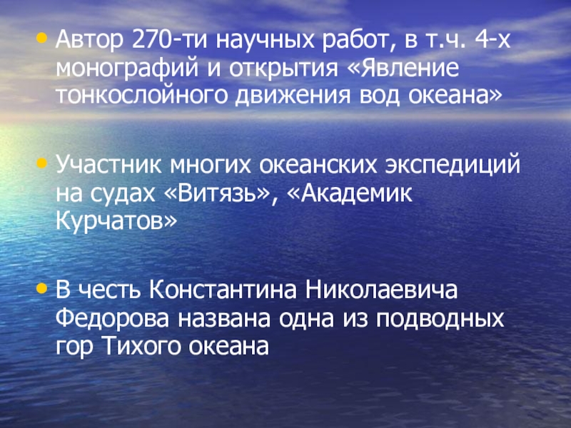В честь Константина Николаевича Федорова названа одна из подводных гор Тихого океана
