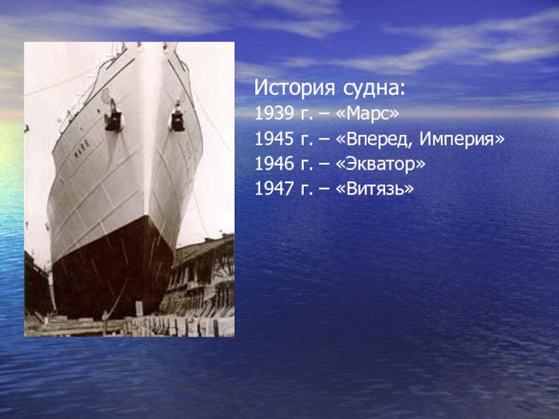 Слайд 4Судно построено в 1939 году в городе Бремерхафене (Германия) как грузо-пассажирский