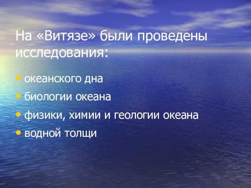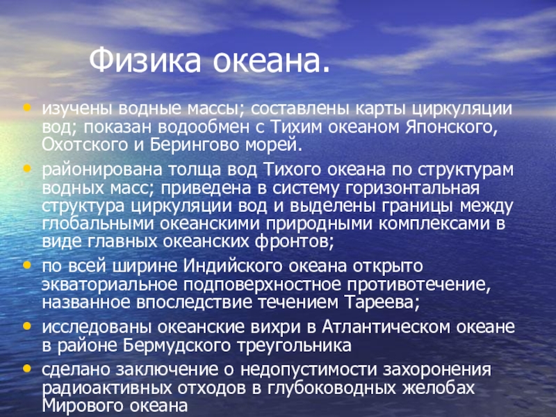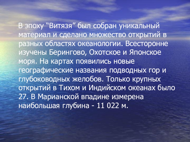 множество открытий в разных областях океанологии. Всесторонне изучены Берингово, Охотское и Японское моря. На картах появились новые географические названия подводных гор и глубоководных желобов. Только крупных открытий в Тихом и Индийском океанах было 27. В Марианской впадине измерена наибольшая глубина - 11 022 м.
