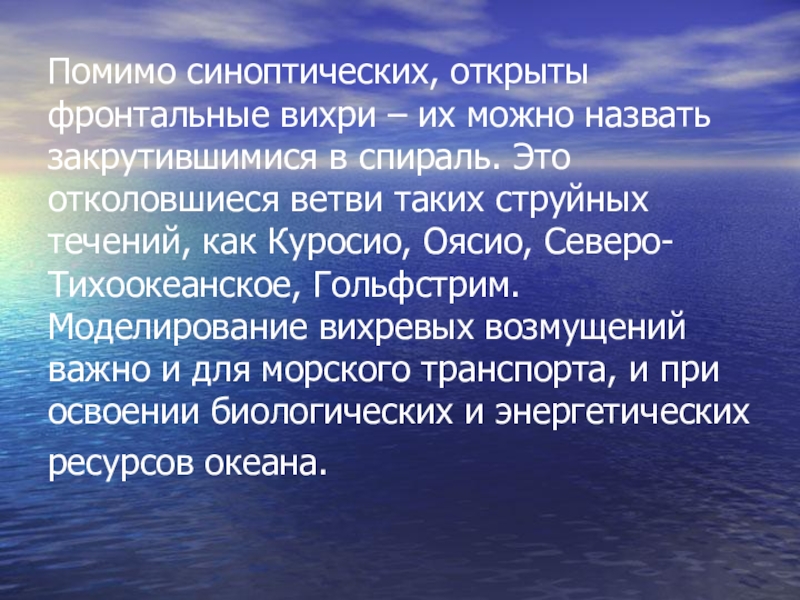 спираль. Это отколовшиеся ветви таких струйных течений, как Куросио, Оясио, Северо-Тихоокеанское, Гольфстрим. Моделирование вихревых возмущений важно и для морского транспорта, и при освоении биологических и энергетических ресурсов океана.