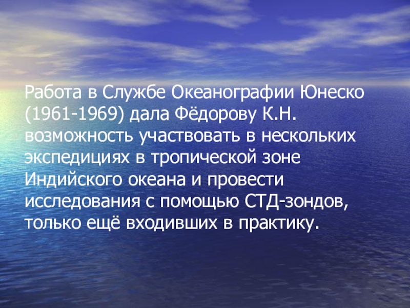 Слайд 102Работа в Службе Океанографии Юнеско (1961-1969) дала Фёдорову К.Н. возможность участвовать