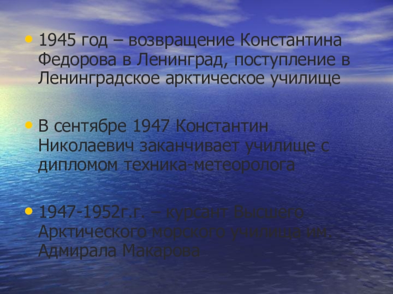 1947-1952г.г. – курсант Высшего Арктического морского училища им. Адмирала Макарова