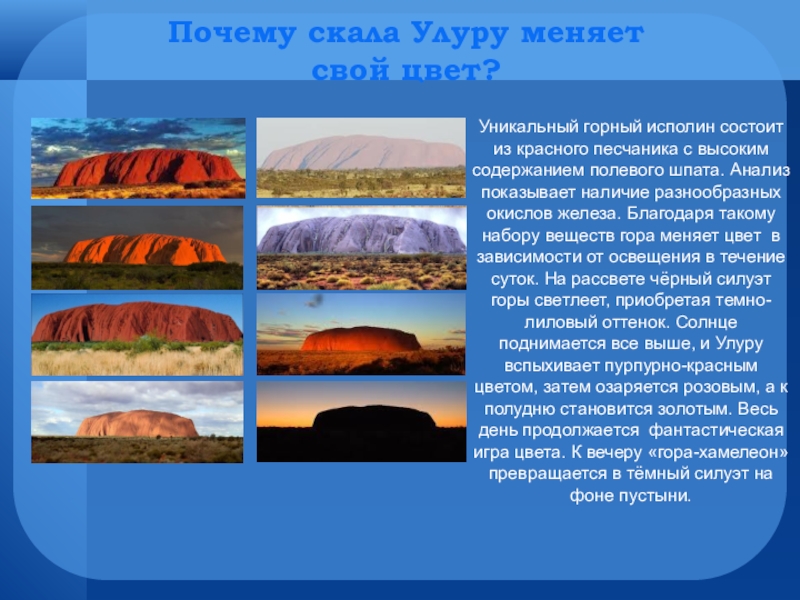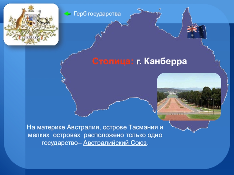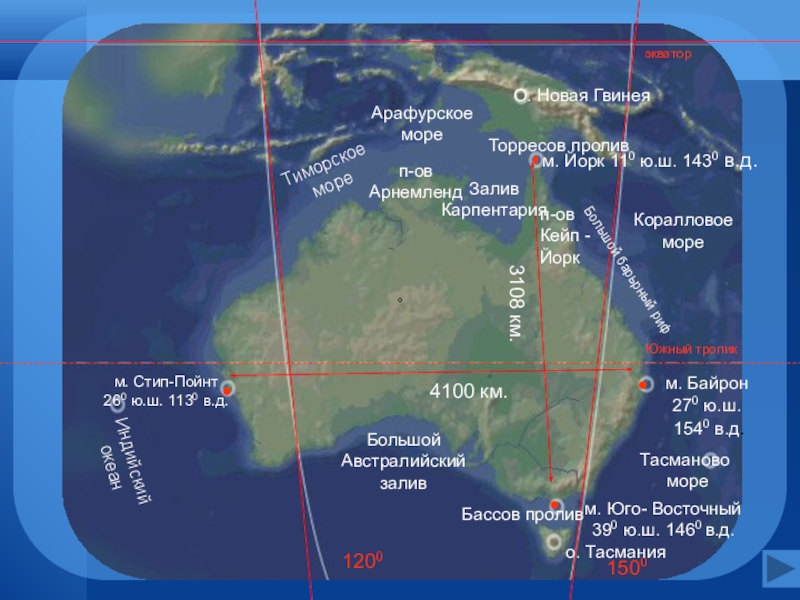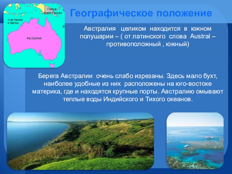 Австралия целиком находится в южном полушарии – ( от латинского слова Austral – противоположный , южный)