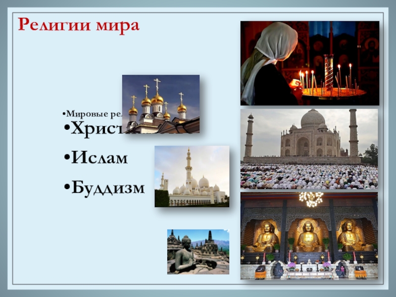 Буддизм – 350 млн. чел. – Центральная, Ю-В, Восточная Азия: Китай, Монголия, Мьянма, Таиланд, Вьетнам.