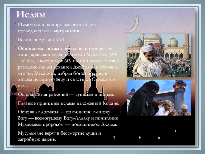 Ислам одна из мировых религий, ее последователи – мусульмане.