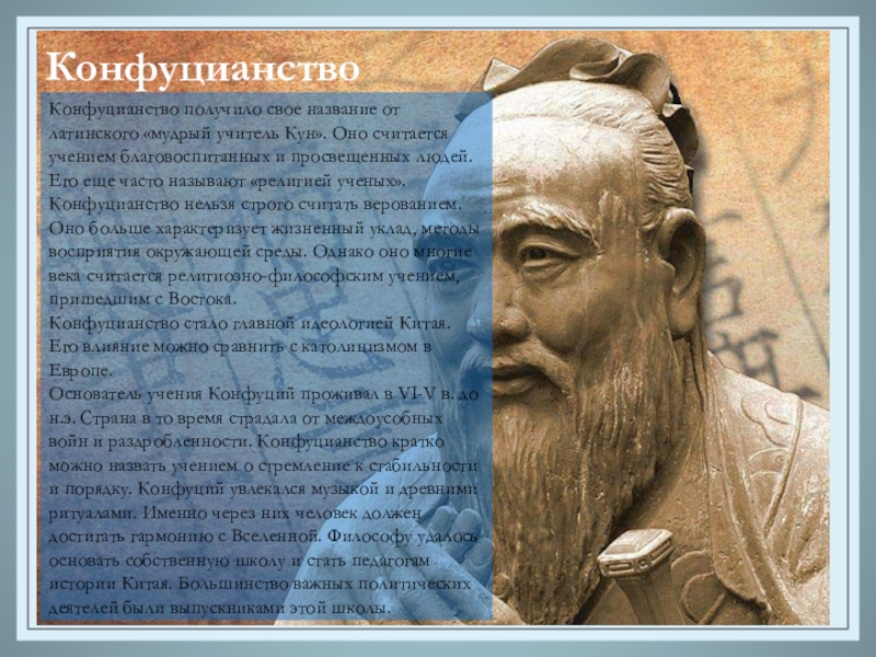Конфуцианство получило свое название от латинского «мудрый учитель Кун». Оно