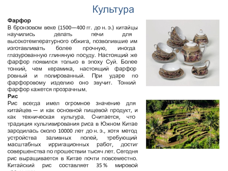 Рис всегда имел огромное значение для китайцев — и как основной пищевой продукт, и как техническая культура. Считается, что традиция культивирования риса в Южном Китае зародилась около 10000 лет до н. э., хотя метод устройства заливных полей, требующий масштабных ирригационных работ, достиг совершенства по прошествии тысяч лет. Сегодня рис выращивается в Китае почти повсеместно. Китайский рис составляет 35 % мировой продукции.