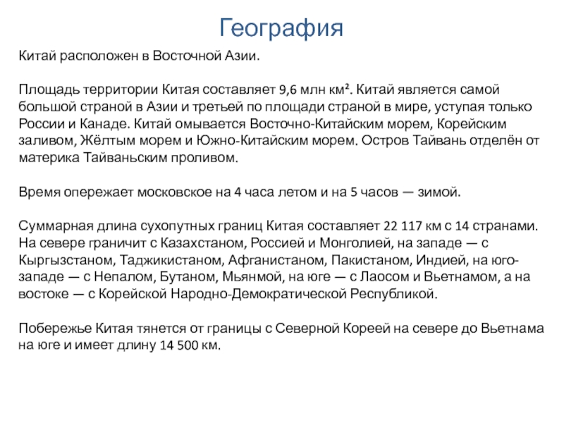 Китай является самой большой страной в Азии и третьей по площади страной в мире, уступая только России и Канаде. Китай омывается Восточно-Китайским морем, Корейским заливом, Жёлтым морем и Южно-Китайским морем. Остров Тайвань отделён от материка Тайваньским проливом.