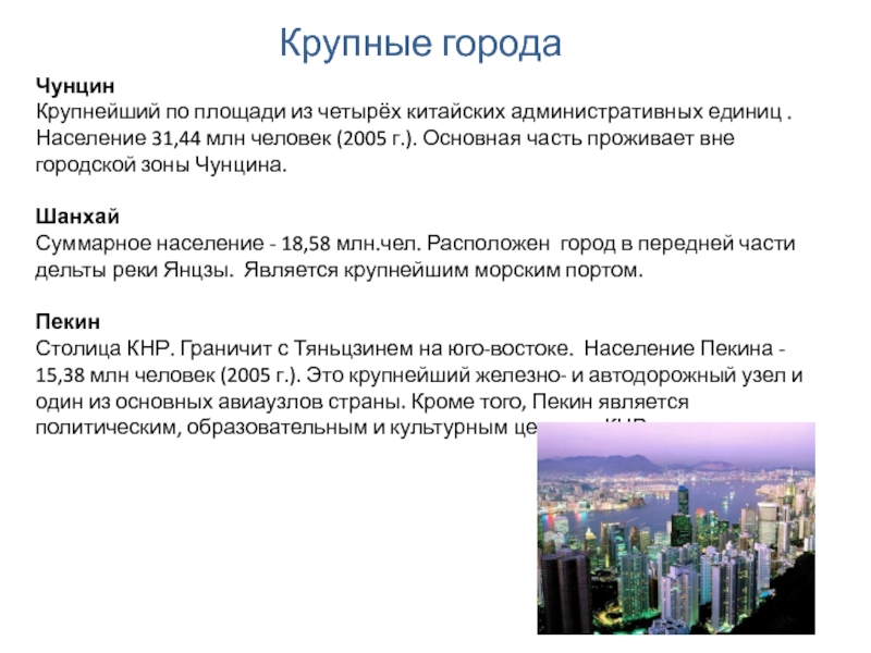Крупные города Китая. Шанхай, Тяньцзинь, Чунцин, Сянган, Шэньян, Ухань, Гуанчжоу, Харбин.