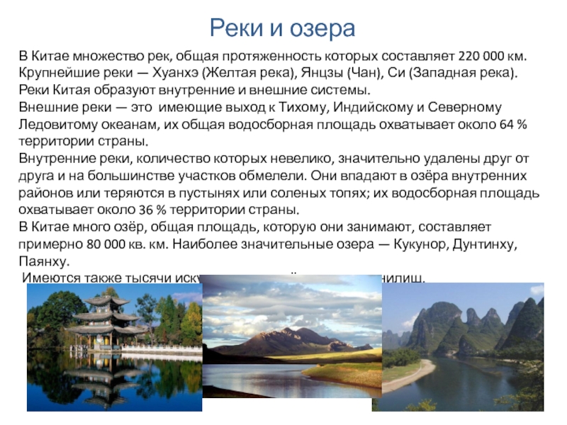 В Китае много озёр, общая площадь, которую они занимают, составляет примерно 80 000 кв. км. Наиболее значительные озера — Кукунор, Дунтинху, Паянху.
