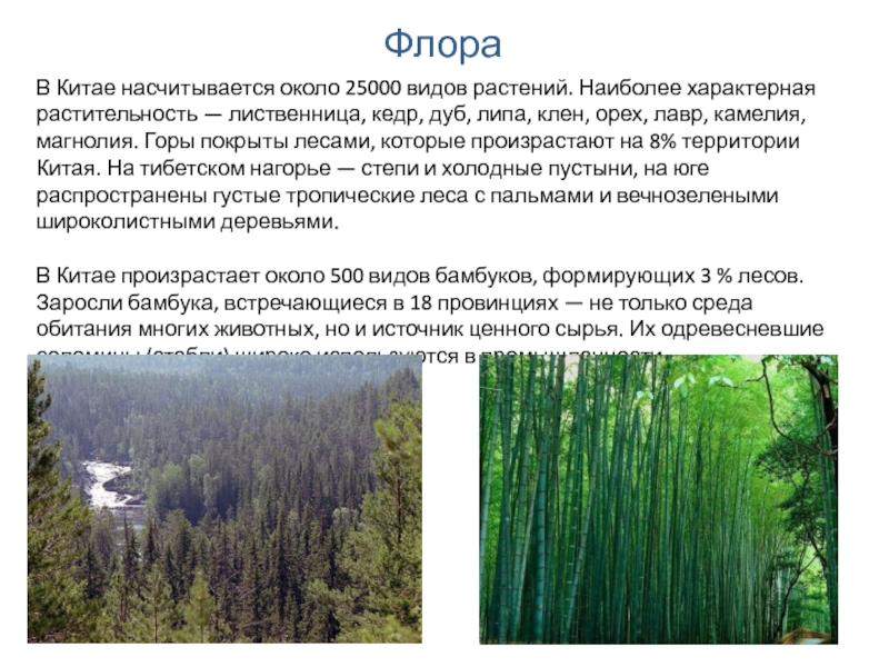 лиственница, кедр, дуб, липа, клен, орех, лавр, камелия, магнолия. Горы покрыты лесами, которые произрастают на 8% территории Китая. На тибетском нагорье — степи и холодные пустыни, на юге распространены густые тропические леса с пальмами и вечнозелеными широколистными деревьями.