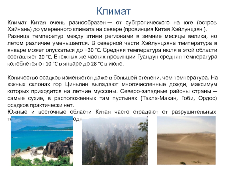 Климат Китая очень разнообразен — от субтропического на юге (остров Хайнань) до