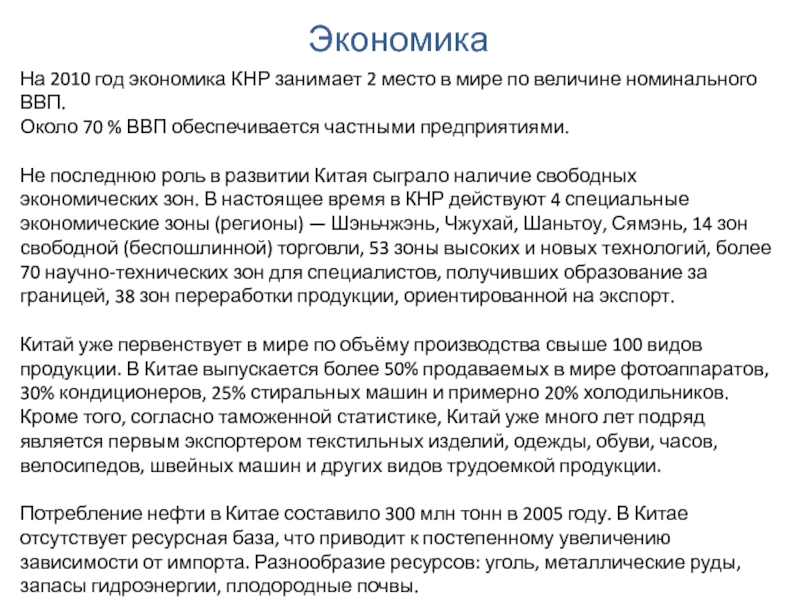На 2010 год экономика КНР занимает 2 место в мире по