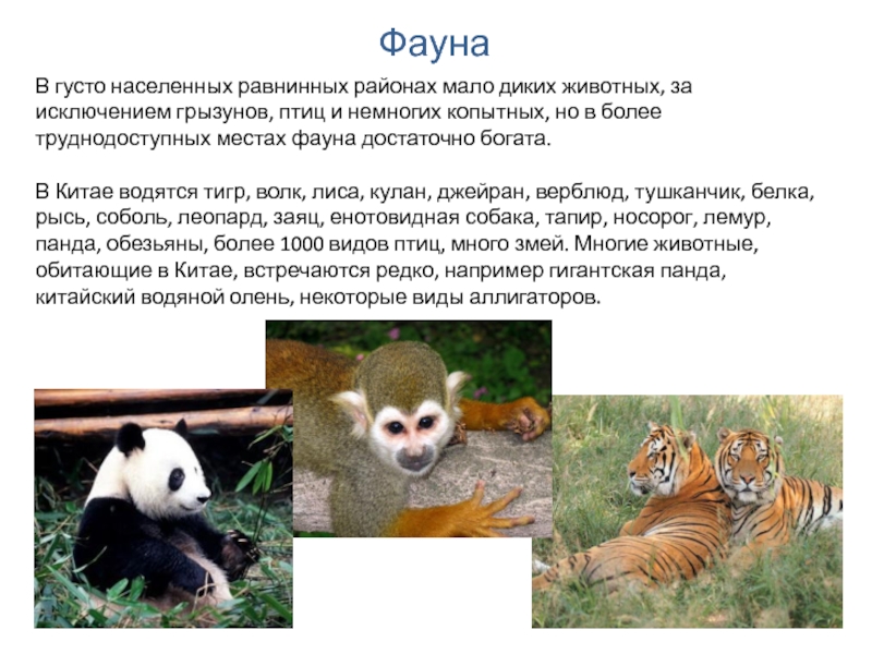 В Китае водятся тигр, волк, лиса, кулан, джейран, верблюд, тушканчик, белка, рысь, соболь, леопард, заяц, енотовидная собака, тапир, носорог, лемур, панда, обезьяны, более 1000 видов птиц, много змей. Многие животные, обитающие в Китае, встречаются редко, например гигантская панда, китайский водяной олень, некоторые виды аллигаторов.
