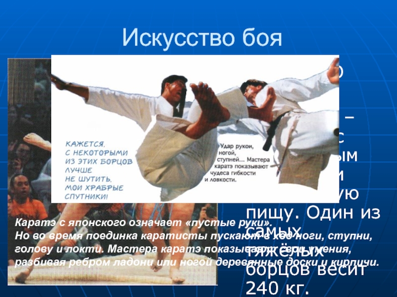 Но во время поединка каратисты пускают в ход ноги, ступни, голову и локти. Мастера каратэ показывают свои умения, разбивая ребром ладони или ногой деревянные доски и кирпичи.