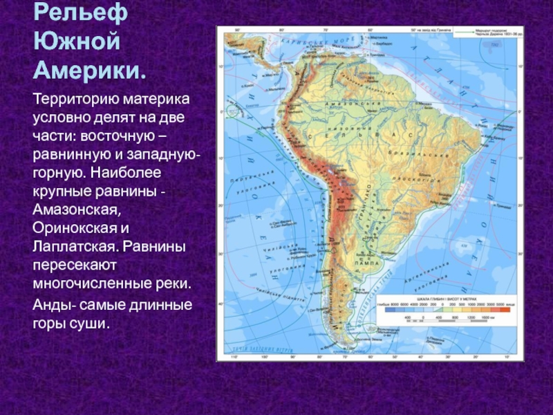 Рельеф Южной Америки.Территорию материка условно делят на две части: восточную – равнинную и западную- горную. Наиболее крупные