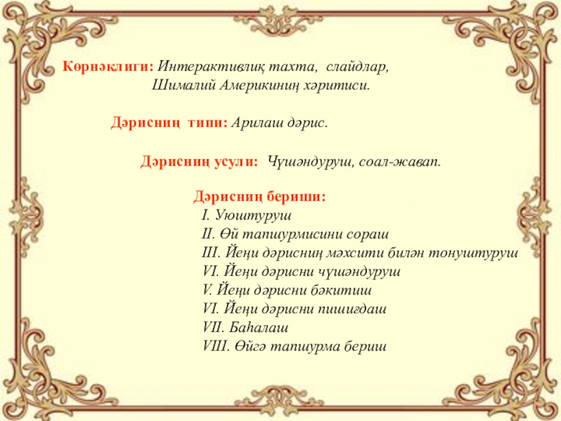 Слайд 4Көрнәклиги: Интерактивлиқ тахта, слайдлар,