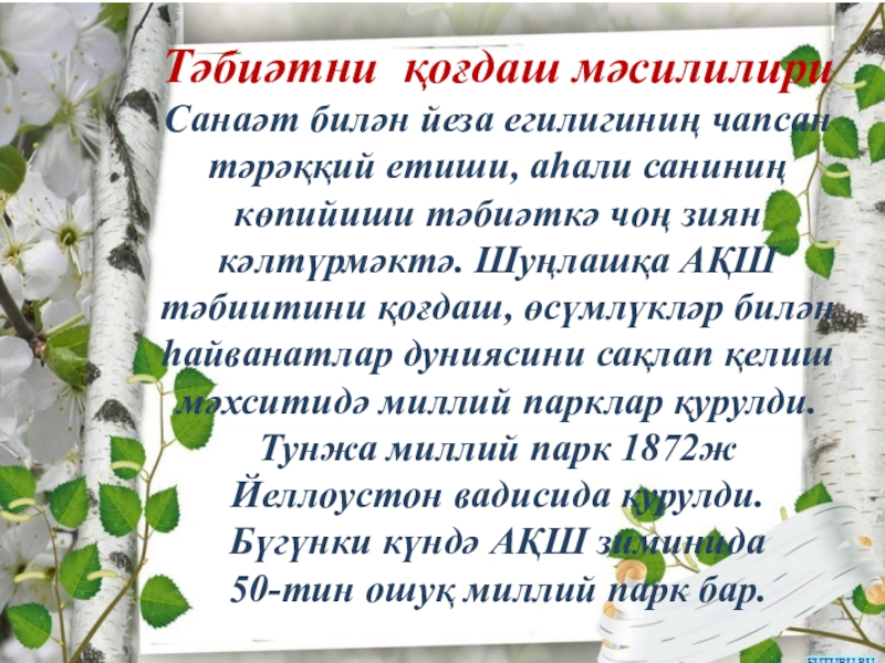 Слайд 475. Дуния йүзи бойичә тунжа қетим қурулған миллий парк?