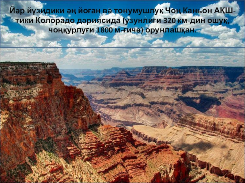 Слайд 30Йәр йүзидики әң йоған вә тонумушлуқ Чоң Каньон АҚШ-тики Колорадо дәриясида (узунлиғи 320 км-дин
