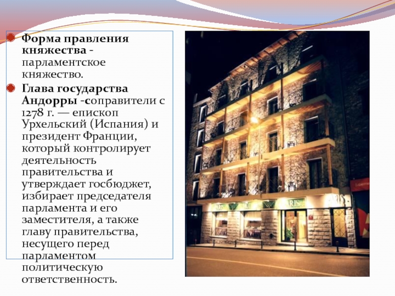 г. — епископ Урхельский (Испания) и президент Франции, который контролирует деятельность правительства и утверждает госбюджет, избирает председателя парламента и его заместителя, а также главу правительства, несущего перед парламентом политическую ответственность.