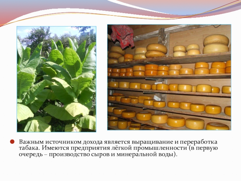 Слайд 14Важным источником дохода является выращивание и переработка табака. Имеются предприятия лёгкой
