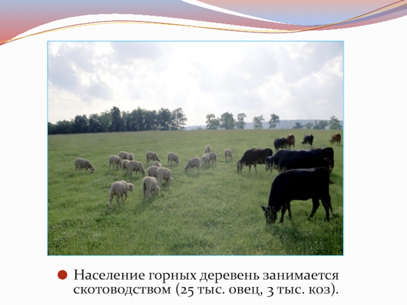 Слайд 15Население горных деревень занимается скотоводством (25 тыс. овец, 3 тыс. коз).
