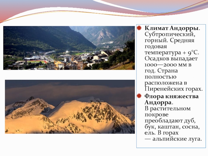 Слайд 12Климат Андорры. Субтропический, горный. Средняя годовая температура + 9°С. Осадков выпадает
