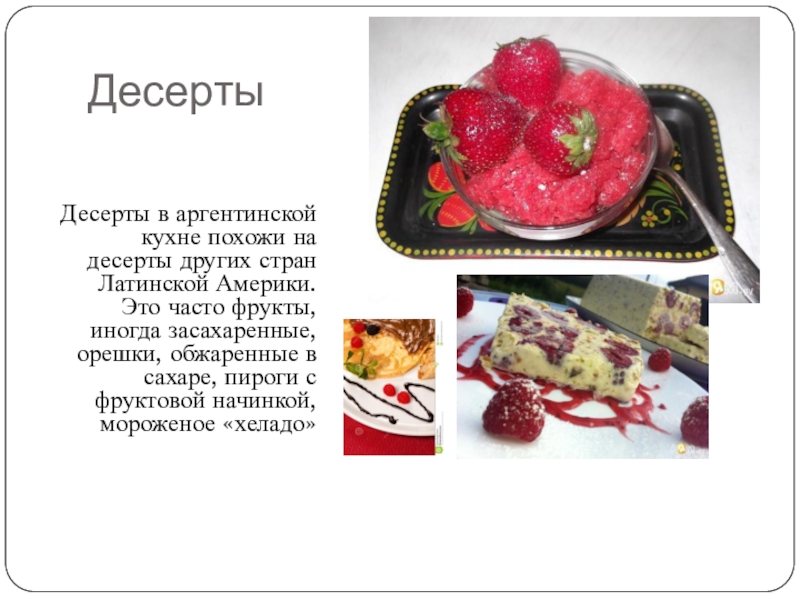 ДесертыДесерты в аргентинской кухне похожи на десерты других стран Латинской Америки. Это часто фрукты, иногда засахаренные, орешки,