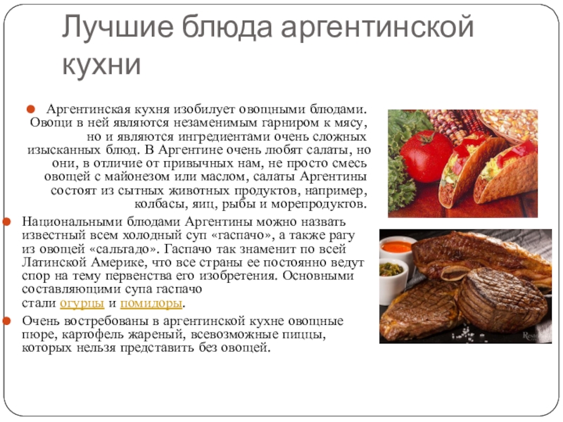 Лучшие блюда аргентинской кухниАргентинская кухня изобилует овощными блюдами. Овощи в ней являются незаменимым гарниром к мясу, но
