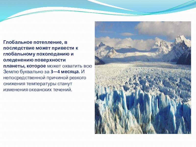 поверхности планеты, которое может охватить всю Землю буквально за 3—4 месяца. И непосредственной причиной резкого снижения температуры станут изменения океанских течений.