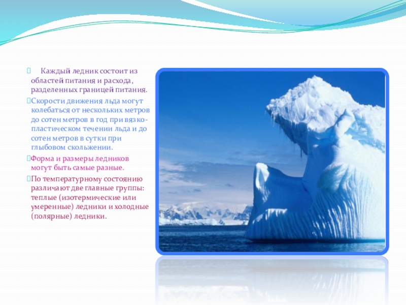Слайд 4 Каждый ледник состоит из областей питания и расхода,