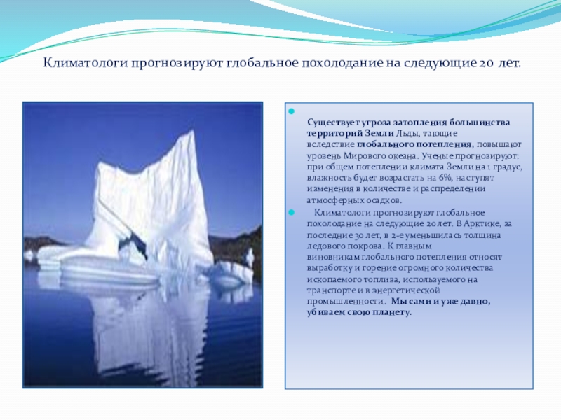 Климатологи прогнозируют глобальное похолодание на следующие 20 лет. В Арктике, за последние 30 лет, в 2-е уменьшилась толщина ледового покрова. К главным виновникам глобального потепления относят выработку и горение огромного количества ископаемого топлива, используемого на транспорте и в энергетической промышленности. Мы сами и уже давно, убиваем свою планету.