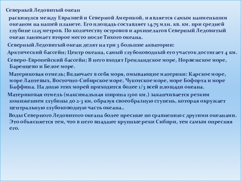 Северной Америкой, и является самым наименьшим океаном на нашей планете. Его площадь составляет 14,75 млн. кв. км. при средней глубине 1225 метров. По количеству островов и архипелагов Северный Ледовитый океан занимает второе место после Тихого океана.