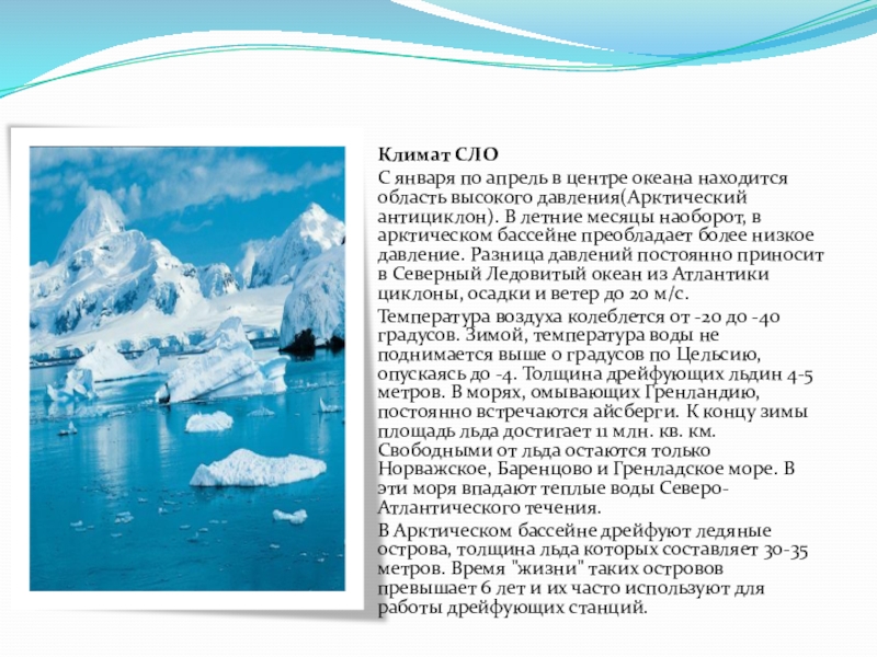 В Арктическом бассейне дрейфуют ледяные острова, толщина льда которых составляет 30-35 метров. Время "жизни" таких островов превышает 6 лет и их часто используют для работы дрейфующих станций.
