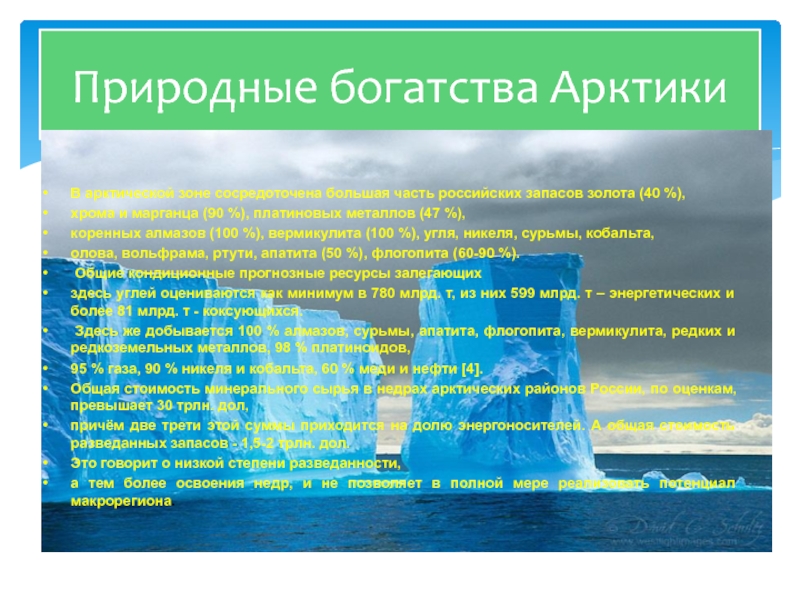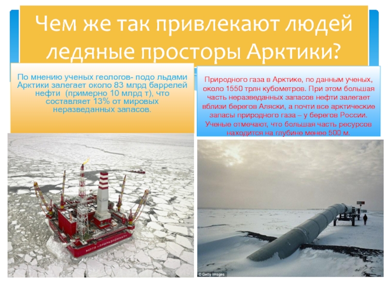Природного газа в Арктике, по данным ученых, около 1550 трлн кубометров. При этом большая часть неразведанных запасов нефти залегает вблизи берегов Аляски, а почти все арктические запасы природного газа – у берегов России. Ученые отмечают, что большая часть ресурсов находится на глубине менее 500 м.