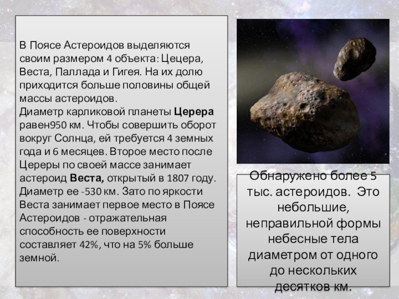 Обнаружено более 5 тыс. астероидов. Это небольшие, неправильной формы небесные тела диаметром от одного до нескольких десятков км.