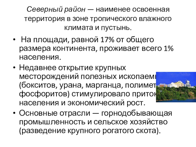 Слайд 21Северный район — наименее освоенная территория в зоне тропического влажного климата и
