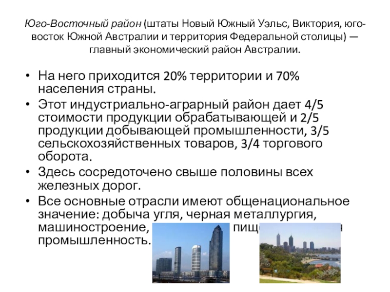 Слайд 18Юго-Восточный район (штаты Новый Южный Уэльс, Виктория, юго-восток Южной Австралии и территория