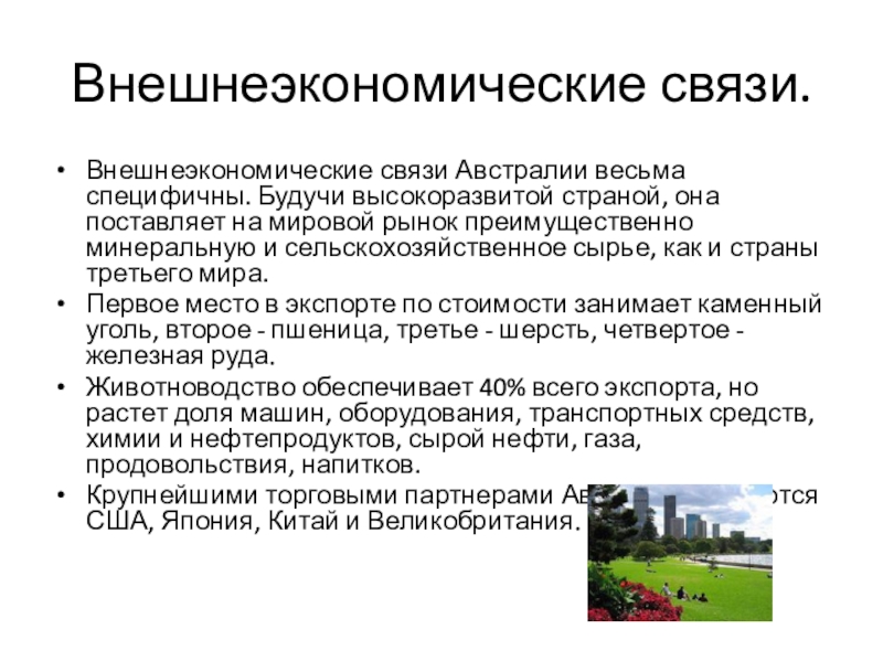 Внешнеэкономические связи Австралии весьма специфичны. Будучи высокоразвитой страной, она поставляет
