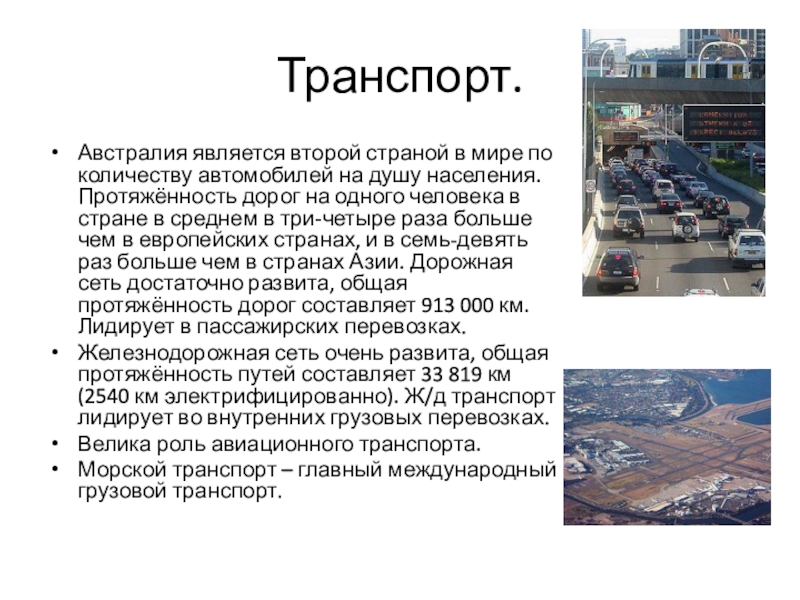 Австралия является второй страной в мире по количеству автомобилей на душу населения. Протяжённость дорог