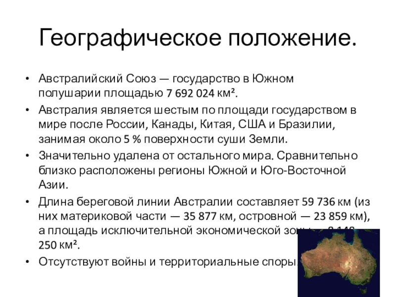 Длина береговой линии Австралии составляет 59 736 км (из них материковой части — 35 877 км, островной — 23 859 км), а площадь исключительной экономической зоны — 8 148 250 км².