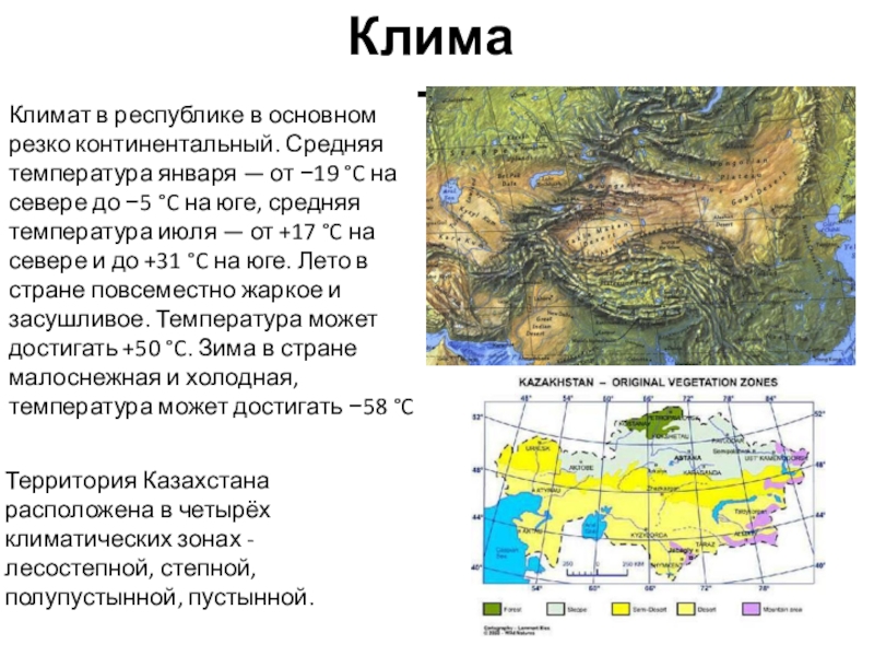 Климат в республике в основном резко континентальный. Средняя температура января — от −19 °C на севере до −5 °C на юге, средняя температура июля — от +17 °C на севере и до +31 °C на юге. Лето в стране повсеместно жаркое и засушливое. Температура может достигать +50 °C. Зима в стране малоснежная и холодная, температура может достигать −58 °C