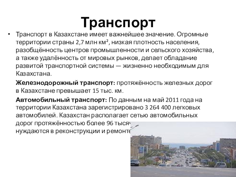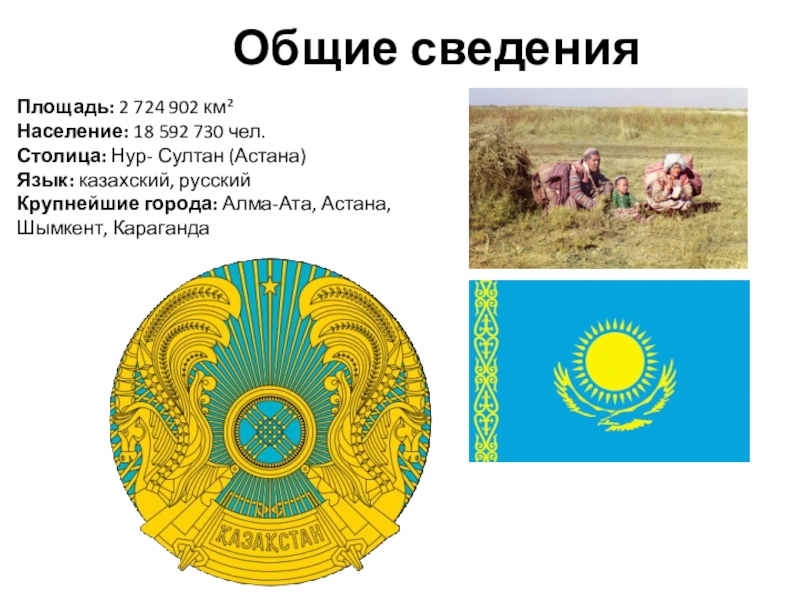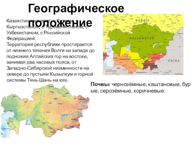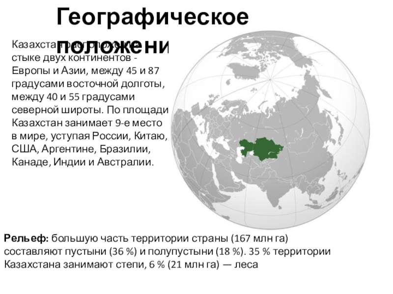 Рельеф: большую часть территории страны (167 млн га) составляют пустыни (36 %) и полупустыни (18 %). 35 % территории Казахстана занимают степи, 6 % (21 млн га) — леса