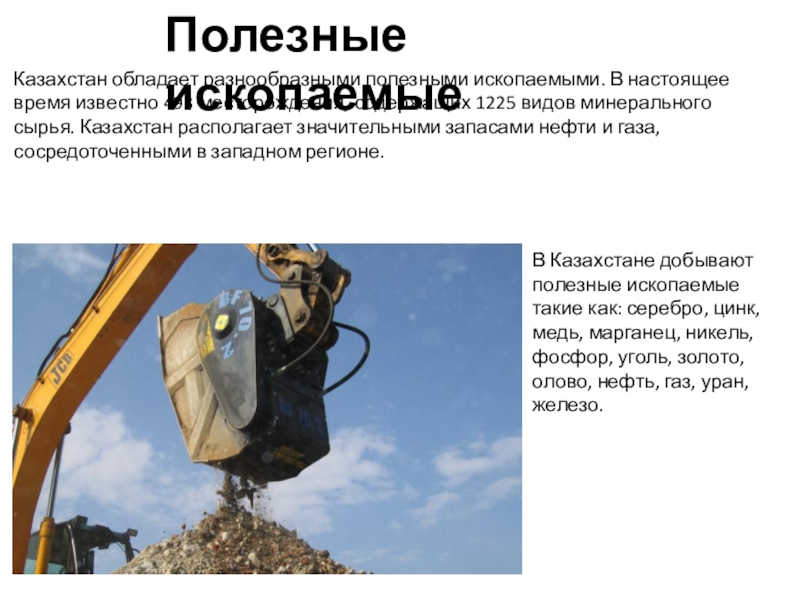 В Казахстане добывают полезные ископаемые такие как: серебро, цинк, медь, марганец, никель, фосфор, уголь, золото, олово, нефть, газ, уран, железо.