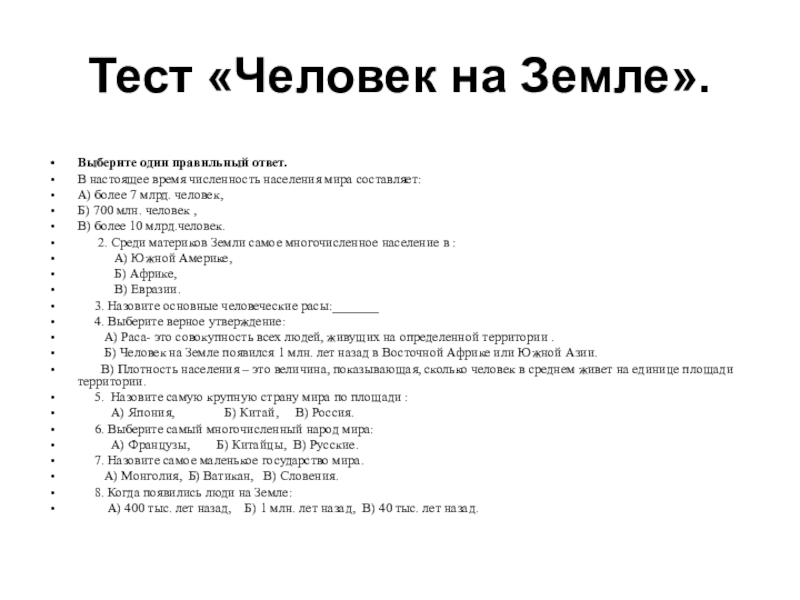 Слайд 17Тест «Человек на Земле».
