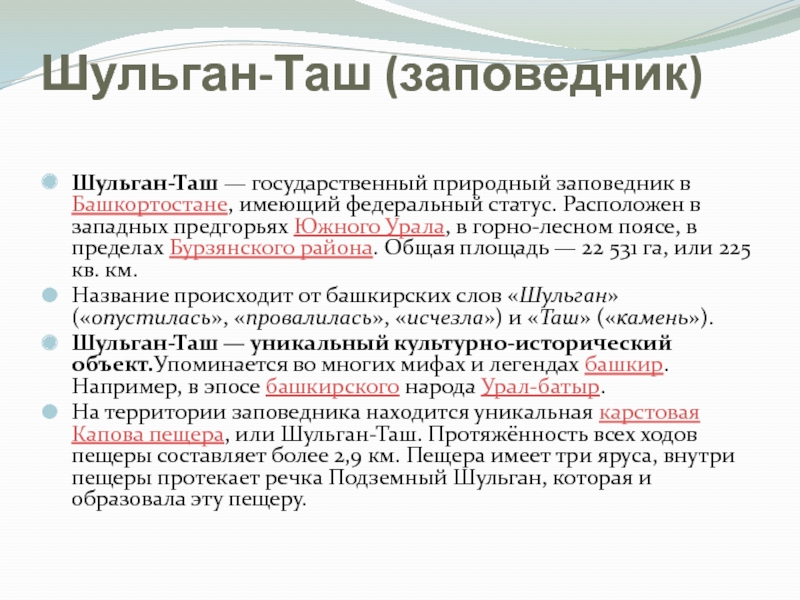 Шульган-Таш — государственный природный заповедник в Башкортостане, имеющий федеральный статус. Расположен