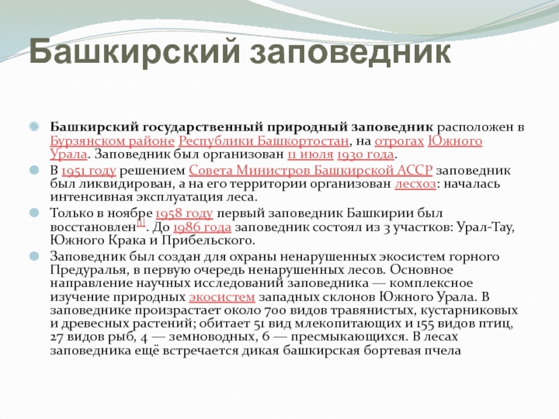 исключена из хозяйственной деятельности. В башкортостане есть три заповедника: